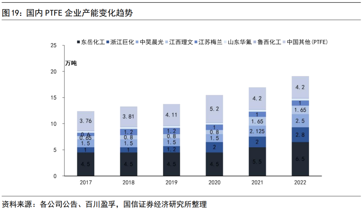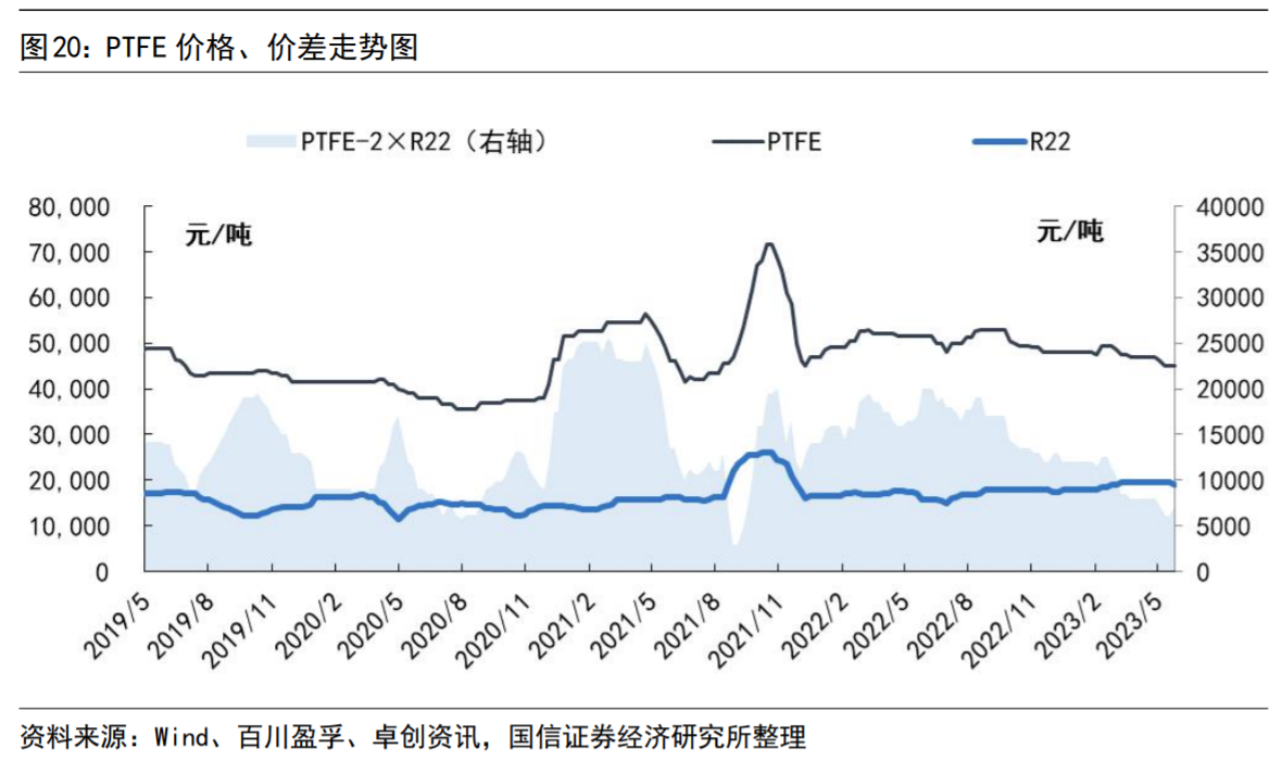 公司PTFE产品定位高端,产品性能和技术优势明显。主要原料自主配套,成本控制具有优势。截至2022年末,公司聚四氟乙烯树脂(PTFE)产能达3万吨/年,另有1.85万吨/年在建产能,预计2024年12月建成投产;同时二氟一氯甲烷、四氟乙烯、六氟丙烯等中间体实现配套,成本控制具有优势。