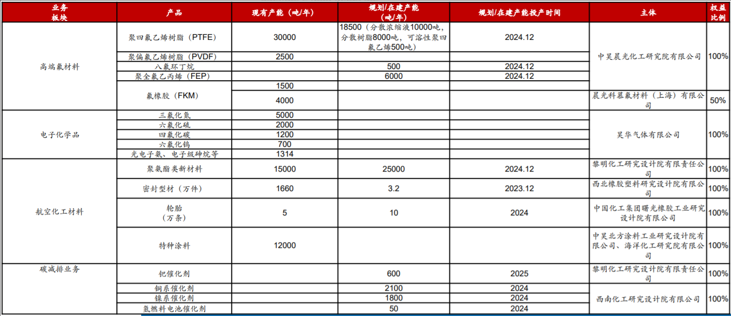 公司已形成了高端氟材料、电子化学品、高端制造化工材料、碳减排业务等四大核心业务,其中,氟树脂及氟橡胶产能、含氟电子特气等产品已居国内领先地位。