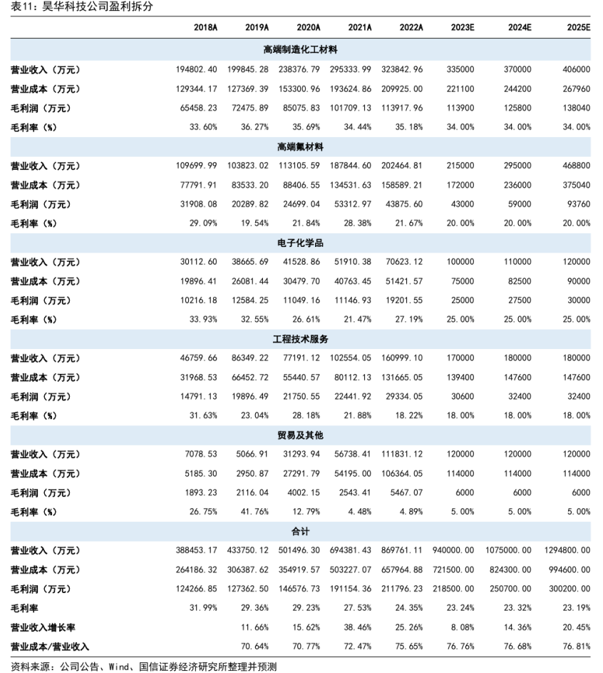 3、电子化学品:公司现有含氟气体材料产能8600吨/年,其中4600吨电子气体项目2022年底投产,2023年才开始贡献业绩,同时,公司近期新规划了6000吨/年三氟化氮产能,建设期约3年。考虑到电子特气领域的国产替代正加快进行,我们预计公司电子化学品业务将保持较快增长。