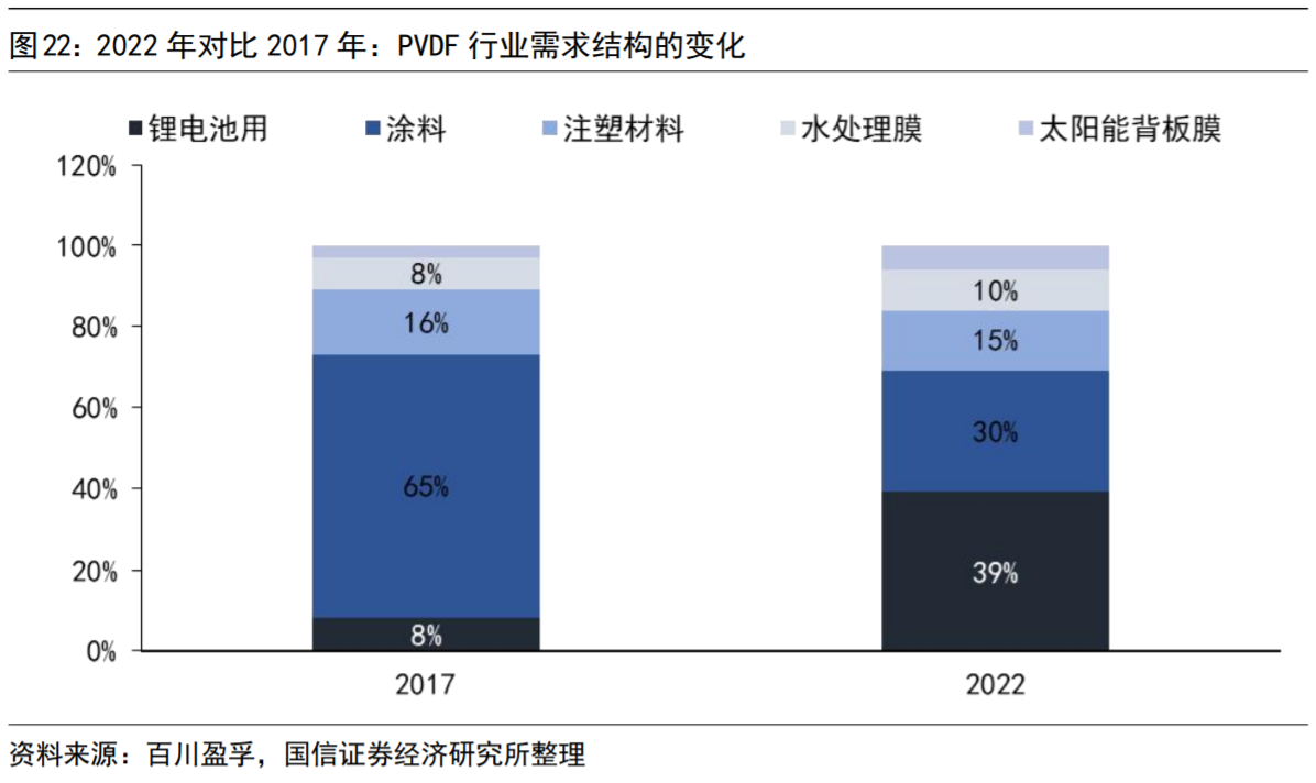 2021年迄今,受下游锂电、光伏等需求快速增长的驱动,PVDF及其原料R142b供应十分紧张、供需严重错配,产品价格均大幅上涨。2022年,从需求结构看,我国PVDF下游锂电池领域的应用已经达到了39%。
