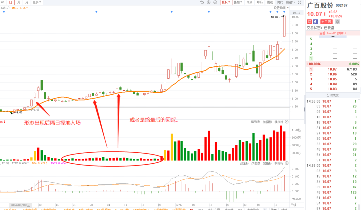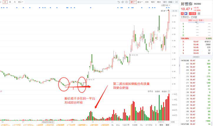24年9月18日,好想你在股价差不多同一平台附近形成双谷呼应,并且第二波放量,完成底部形态,随后开启一波主升浪。