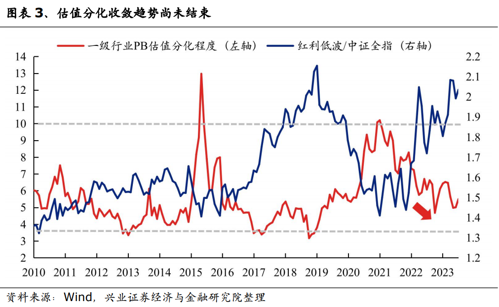 此外,2015年与2021年后红利低波板块大幅跑赢的阶段,均始于市场估值分化达到历史极高水平。而当前市场估值分化程度仍处于2010年以来的57.4%中等水平,估值分化仍有进一步收敛空间。
