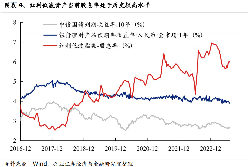 “红利”指代高股息的公司,“低波”指代股价波动水平较低的个股。张启尧研报进一步表示,银行理财收益率持续下行,流动性宽松下国债长端利率短期也易下难上,而红利低波资产当前股息率已超过6%,正处于历史较高水平,和十年期国债收益率利差超3.4%,具备较高配置价值。