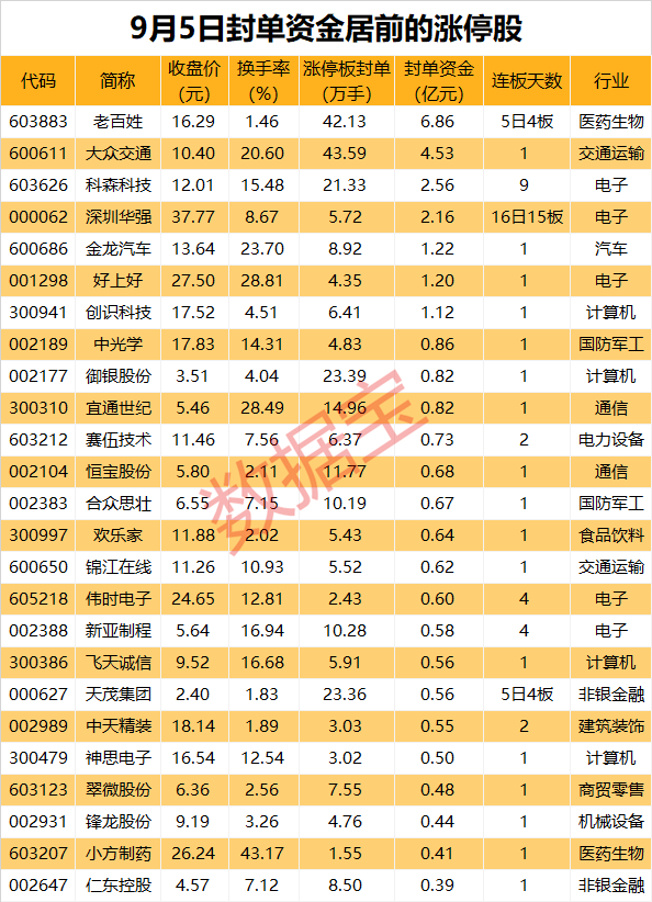 以封单金额计算,7股封单资金超1亿元,老百姓、大众交通、科森科技封单资金居前,分别为6.86亿元、4.53亿元、2.56亿元。
