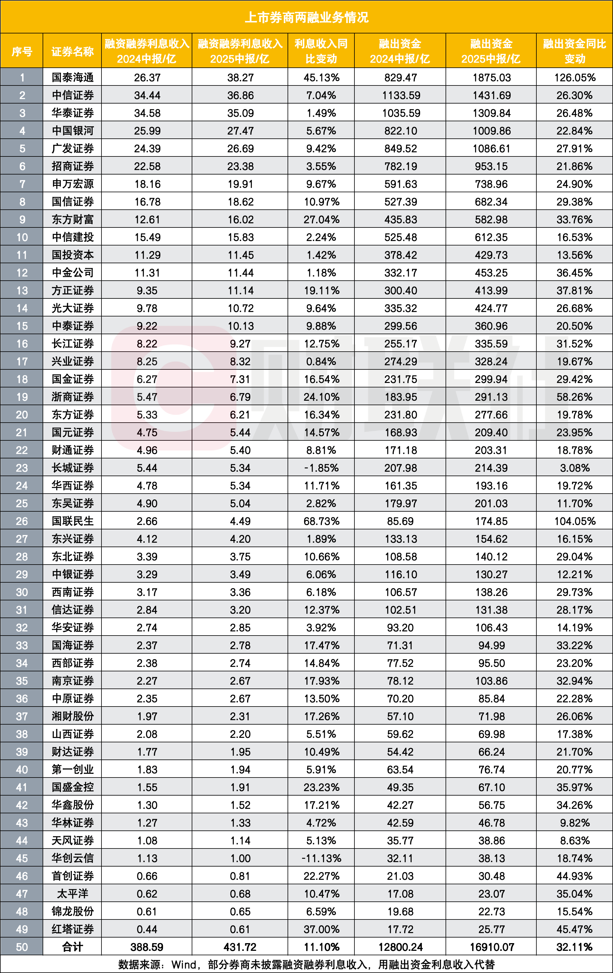 数据显示,49家券商上半年两融利息收入合计432亿元,同比增长超10%,其中47家实现同比正增长,与2024年报中超40家券商两融利息收入下滑的局面形成鲜明对比,行业回暖趋势明确。