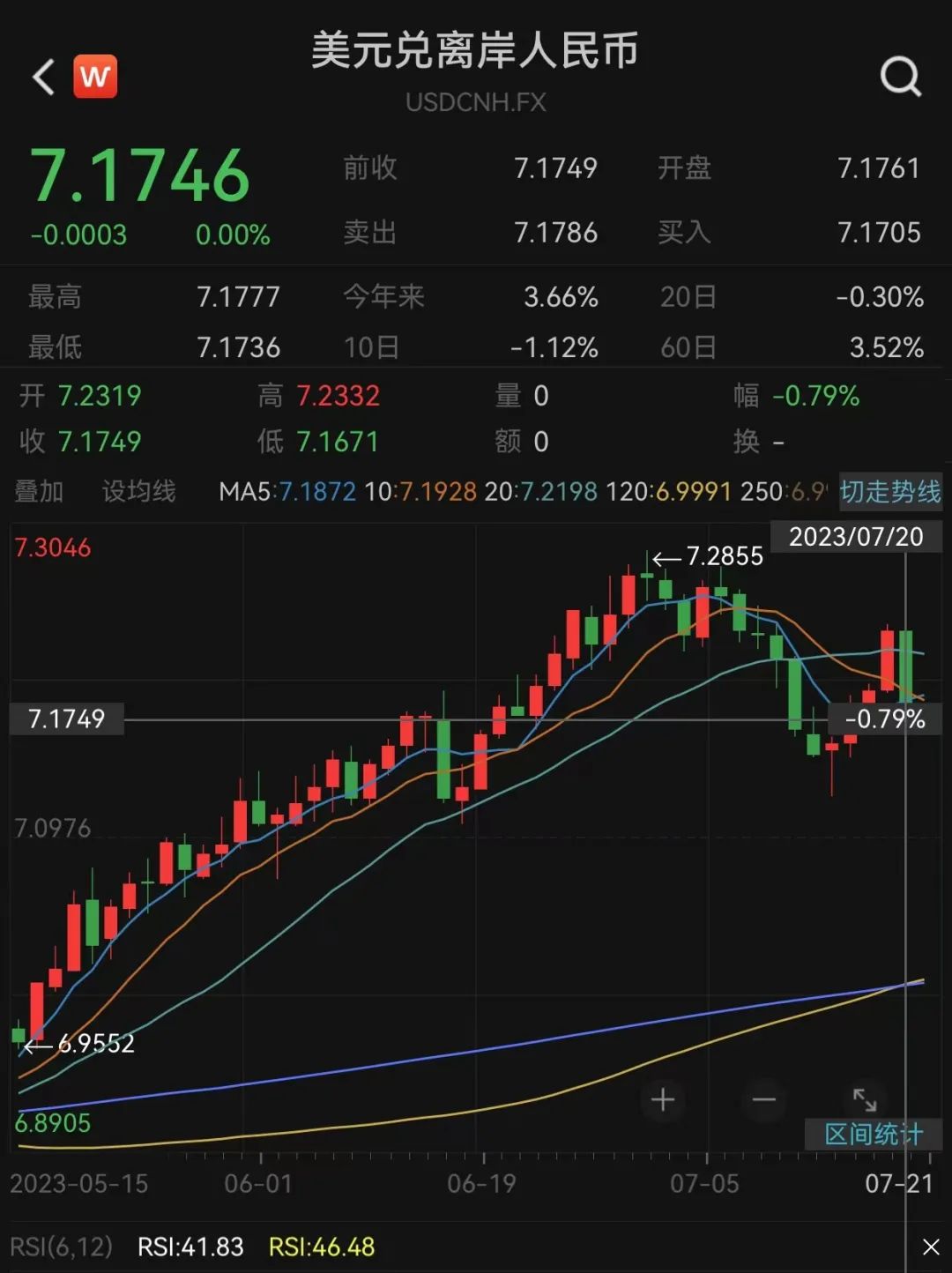 7月20日,人民币保持强势。离岸人民币对美元汇率在接连升破7.23、7.22、7.21、7.20、7.19五道关口后,更是一度收复7.17大关,日内最多上涨近650点,截至收盘,离岸人民币对美元汇率大涨572点。