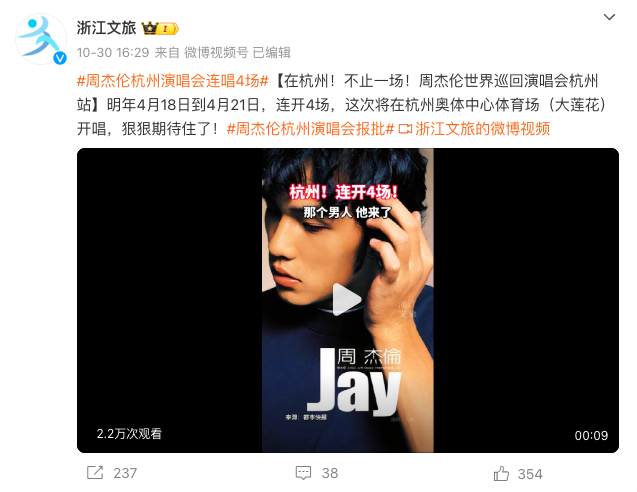 证券时报·e公司记者在文旅部“文旅市场通APP”查询到,周杰伦嘉年华世界巡回演唱会杭州站,将于2024年4月18日举行。此前,浙江文旅厅官方微博发布的消息提到,周杰伦世界巡回演唱会杭州站将于2024年4月18日到4月21日,在杭州奥体中心体育场连开4场。