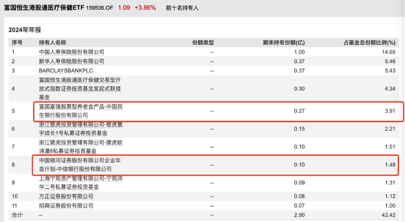 在富国恒生港股通医疗保健ETF中,富国福强股票型养老金产品小幅加仓,而中国银河企业年金计划则小幅减仓。值得注意的是,国寿在2024年四季度大手笔增持1亿份该基金,一跃成为第一大持有人。