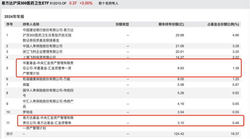 2024年四季度,中央汇金通过“华夏基金—中央汇金资管单一资产管理计划”对易方达沪深300医疗卫生ETF增持了0.25亿份,同时通过“易方达基金—汇金资管单一资产管理计划”增持了3.1份额,增持比例0.35%。