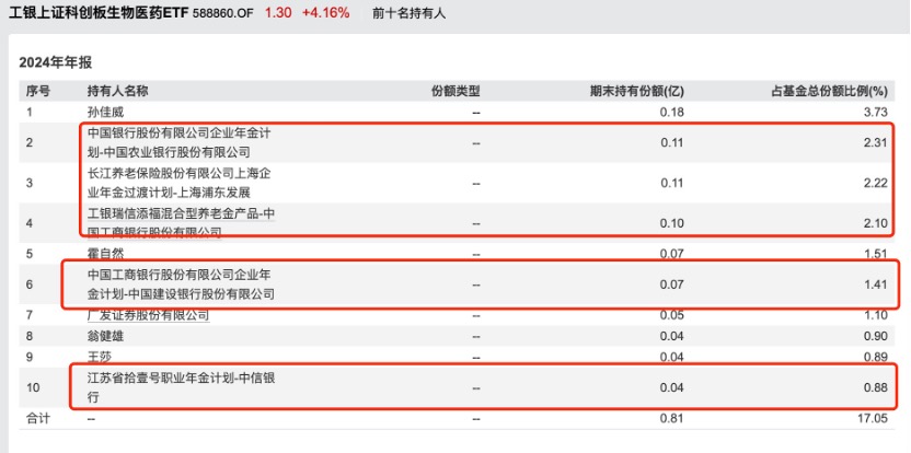 2024年8月上市的工银科创板生物在当年年底前十大持有人“大换血”,获得中国银行企业年金计划、长江养老保险上海企业年金过渡计划、工银瑞信添福混合型养老金产品、以及工商银行企业年金计划、江苏省拾壹号职业年金计划的组团买入,占据了5个席位。