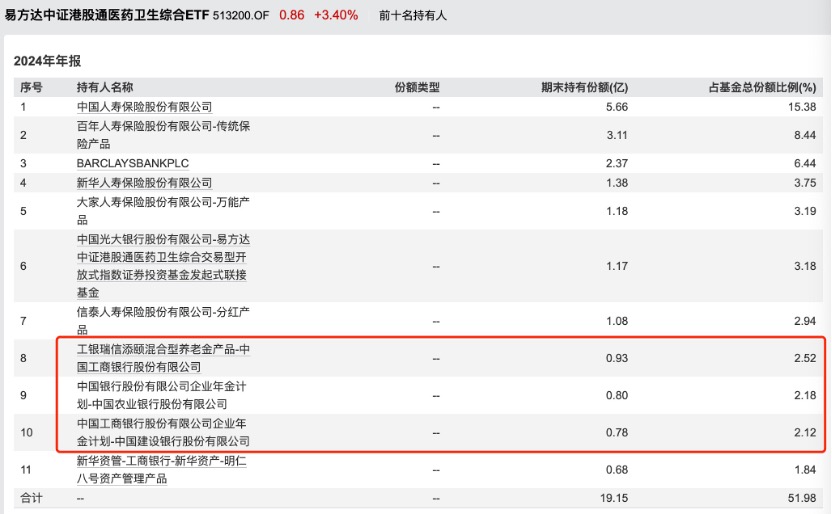 工商银行企业年金在2024年四季度小幅加仓了易方达中证港股通医疗卫生ETF,工银瑞信添颐养老金产品和中国银行企业年金计划则保持仓位未动。