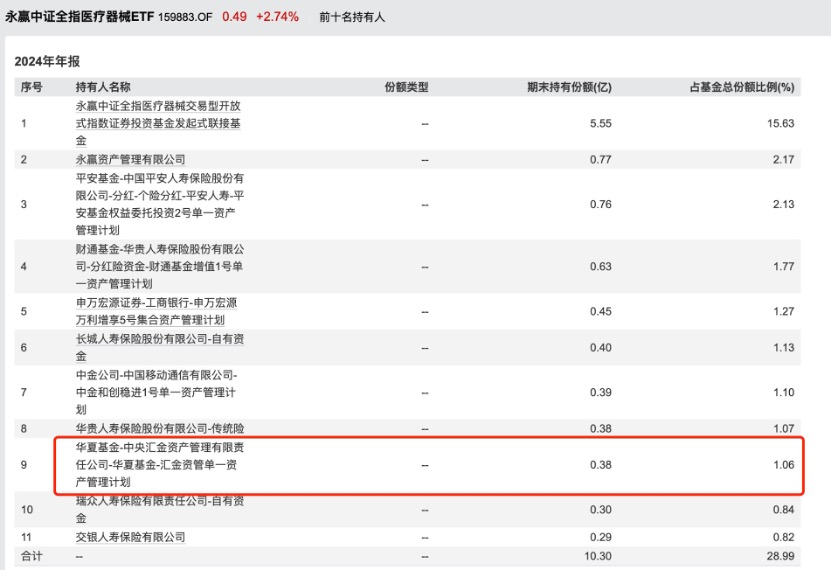 另一个被国家队增持的是永赢中证全指医疗器械ETF,2024年四季度,汇金通过“华夏基金—汇金资管单一资产管理计划”新晋该基金前十大持有人,年报披露显示,新晋3772.02万份,持有市值1829.05万元。