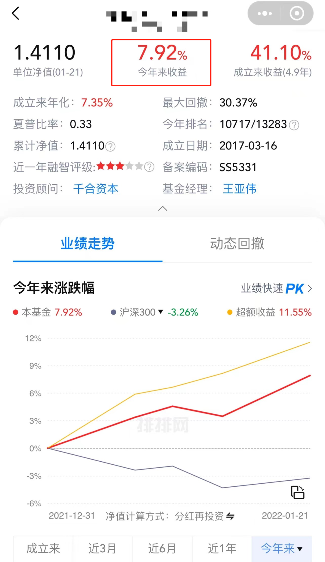 王亚伟自成立私募千合资本以来,业绩并不突出,他本人也较少公开露面。不过,第三方平台数据显示,2022年,他管理的一只代表产品截至1月21日获得了7.92%的正收益。有业绩数据更新的产品,今年以来的平均业绩达2.36%。