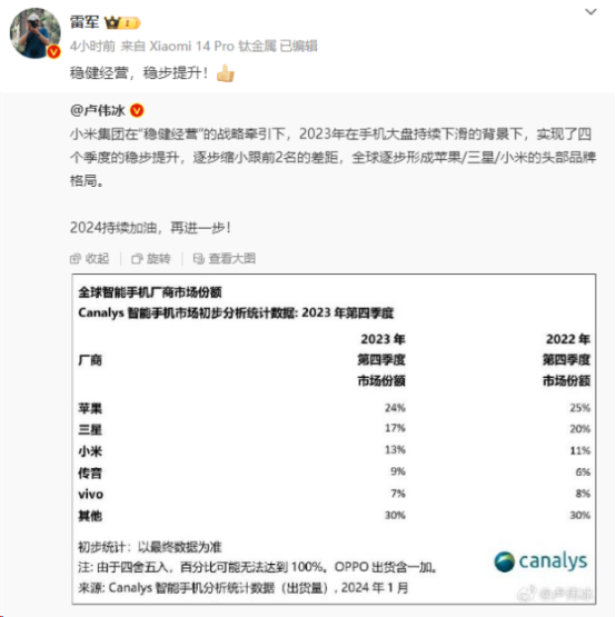 从去年整体情况来看,苹果“赢得了全球市场”,却在中国市场遇到强敌。近日,小米集团合伙人、总裁、Redmi品牌总经理卢伟冰发微博表示:“小米集团在‘稳健经营’的战略牵引下,2023年在手机大盘持续下滑的背景下,实现了四个季度的稳步提升,逐步缩小跟前2名的差距,全球逐步形成苹果、三星、小米的头部品牌格局。”随后小米集团创始人雷军转载其微博。