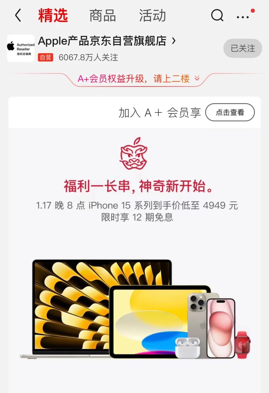 1月17日,苹果官方授权渠道也开启“降价模式”。天猫方面,全线Apple产品官方直降,其中iPhone手机在使用官方券和天猫券后最高降价1000元,4999元起,这是iPhone15官方渠道价首次跌破5000元。除此之外,MacBookAir笔记本最高降价1400元,AppleWatch手表、AirPods耳机都有降价。京东方面,iPhone15通过200元东券+50元可叠加券,到手价4949元起。