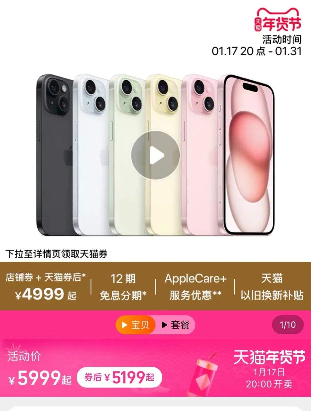 据了解,在1月17日晚8点到1月31日期间,天猫AppleStore旗舰店的iPhone15全系列券后优惠1000元,到手4999元起,比前几天苹果官网推出的“迎新春限时优惠”活动还要便宜500元。