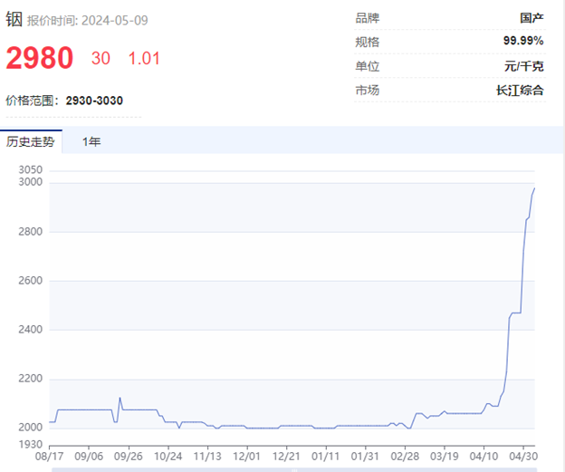 4月中下旬以来,铟价格飞快上涨。根据长江有色最新报价,精铟报价逼近3000元/千克,相比年初涨幅近50%,价格创2016年以来8年多新高。欧洲市场最新铟锭价格报345美元/千克,相比去年低点涨幅近60%,价格也创2016年以来新高。