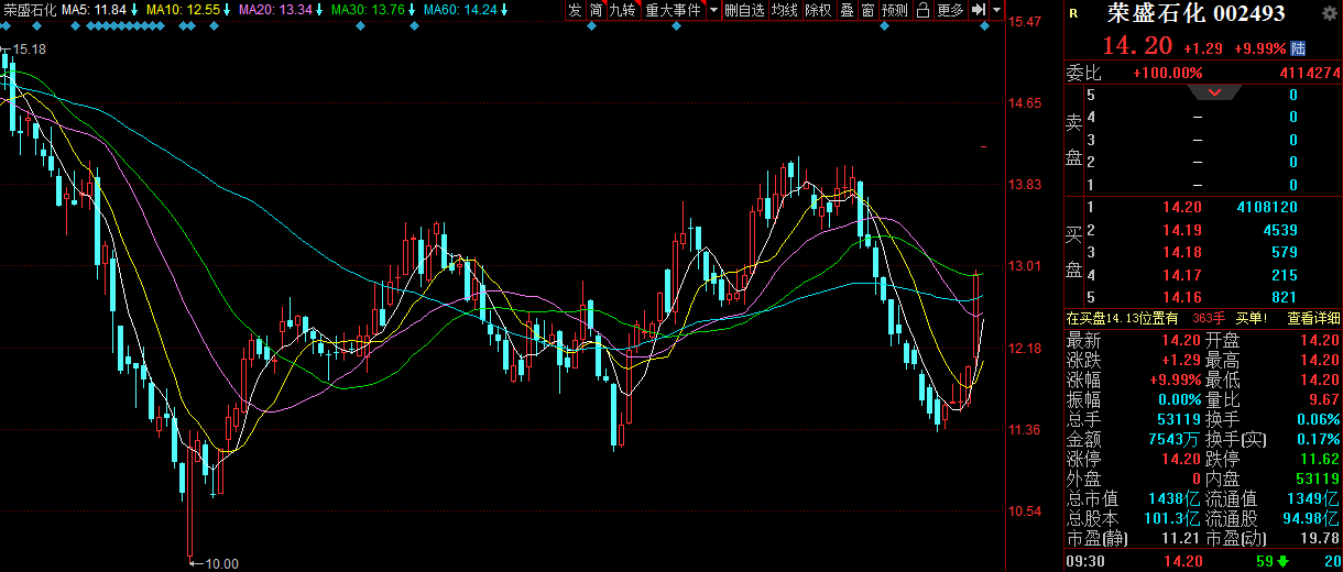 3月28日,荣盛石化涨停开盘,截至发稿,报14.2元,成交额7543万元,总市值1438亿元。