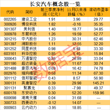 受利好消息影响,11月27日开盘,长安汽车一字涨停,竞价封单金额近40亿元,长安汽车概念相关联A股上市公司相继走高。截至收盘,东箭科技、英唐智控、湖南天雁、瑞玛精密、云内动力收报涨停板。