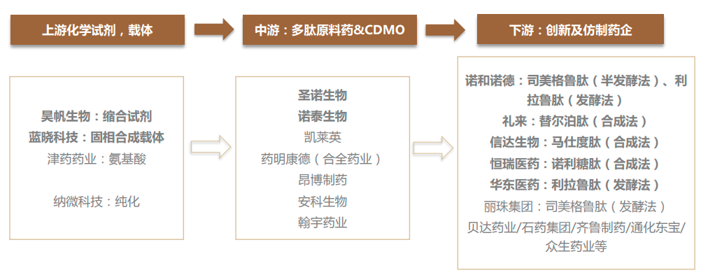 GLP-1产业链上游国内竞争格局更为集中。产业链外包服务看,国内CDMO公司如合全药业,凯莱英,九洲药业等搭建多肽团队及平台,提升GMP级别多肽产品交付能力。