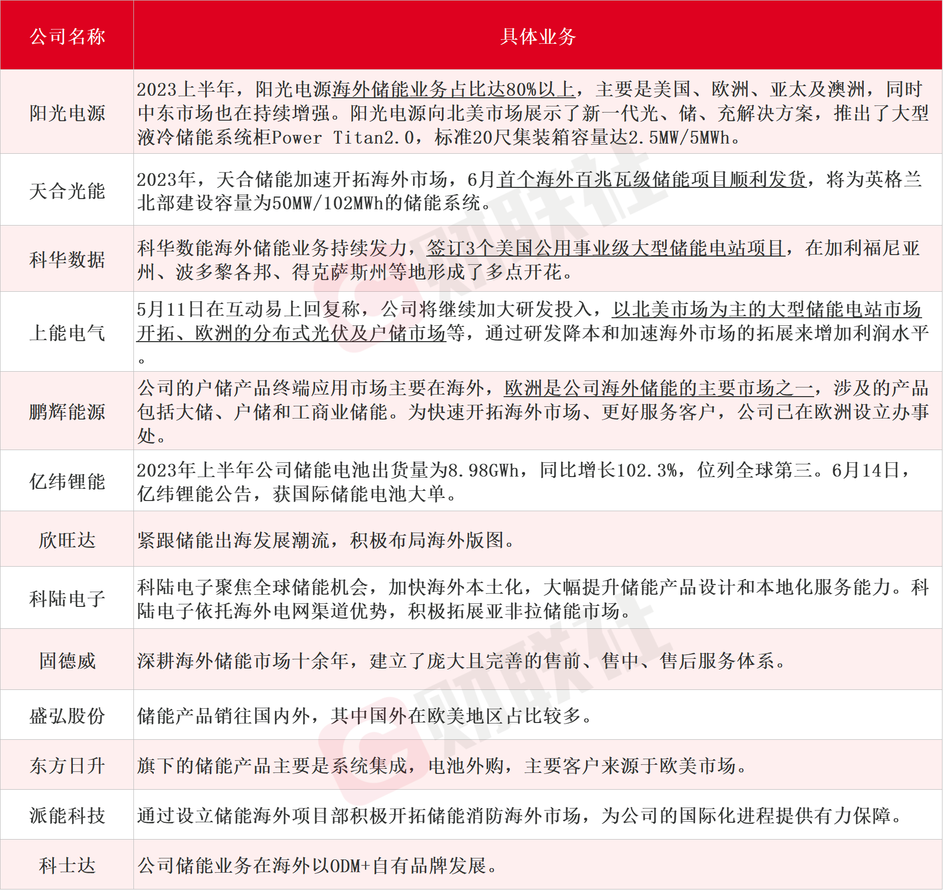 业内人士表示,随着2023年美国光伏装机重新恢复增长及ITC补贴力度的加大,预计美国储能需求将恢复翻倍以上的增速。对此,不少储能企业纷纷加速“出海”,以全面进军海外市场为主要目标。据财联社不完全整理,在海外有布局储能相关业务的上市公司主要为阳光电源、天合光能、科华数据、上能电气、鹏辉能源、亿纬锂能、欣旺达、科陆电子、固德威、盛弘股份、东方日升、派能科技、科士达等,具体情况如下: