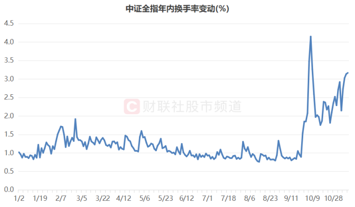 注:中证全指年内换手率变动(截至11月8日收盘)