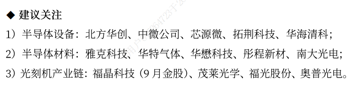 当然,尽管这次荷兰光刻机制裁的情况好于预期,但明年后,ASML未来被限制为受控设备进行维护、修理和提供备件的隐忧仍在,我们还是要防患于未然。因此,无论是整机自研配套零部件,或是备件更换,从长期看更多依赖国内零部件供应商会是大势所趋。短期制裁情况优于此前预期,暂解光刻机行业燃眉之急不改长期加快国产替代自研进程。叠加近期华为Mate60的王者回归,半导体设备&材料环节有望获得投资者青睐。上市公司投资布局方面,梳理相关公司,建议关注如下: