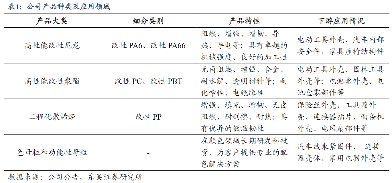 看点一:改性塑料龙头公司主要从事改性塑料产品的研发、生产和销售,下游产品广泛运用于电动工具、汽车零部件、家用电器等多个行业,2011年起开始进入海外市场,2018年后明确聚焦高端市场和高端客户战略,主营业务向结构性材料和高性能改性工程塑料集中,毛利率显著高于同业。