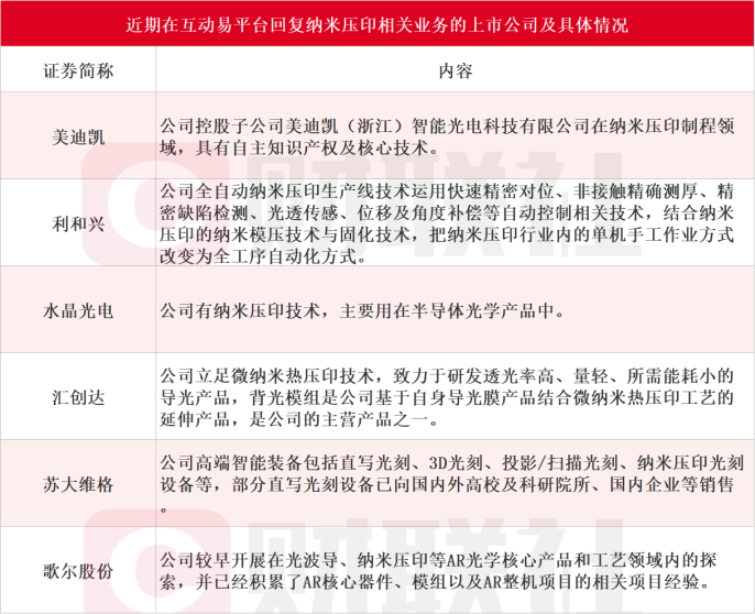 根据财联社不完全整理,近期在互动易平台回复纳米压印相关业务的上市公司包括美迪凯、利和兴、水晶光电、汇创达、苏大维格、歌尔股份等,具体情况如下: