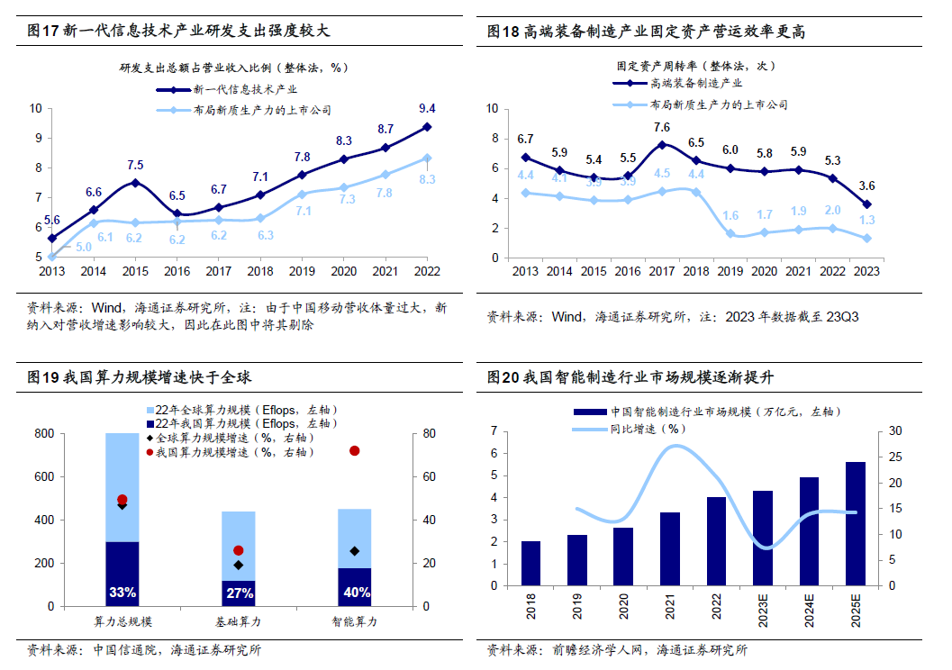 A 股新质生产力板块中共有173家上市公司布局高端装备制造产业,目前在仪器仪表、金属制品、机器人、医疗器械等领域多元化发展。源于其战略性新兴产业和先进制造业于一身的特殊性,高端装备制造产业依托自身工业制造业的产业基础禀赋优势,往往具备较为优质的固定资产装备制造资源,相较于其他战略新兴产业,其13年-23Q3固定资产周转率中枢(下同)为5.8次,高于布局新质生产力的整体水平(3.1次),可见高端装备制造产业或可以借助其先进制造资源的禀赋优势,通过高效利用固定资产以进一步深化发展。当前各企业已在智能制造等领域占据领先地位,根据前瞻经济学人网的数据,22年我国智能制造行业市场规模为4万亿,叠加国家领导层对高端装备制造产业予以重点关注和支持,23年12月国家发改委修订发布《产业结构调整指导目录(2024年本)》,重点强调推动制造业高端化、智能化、绿色化,未来依托雄厚的产业基础和政策的引导支持,有望使技术进一步趋于成熟。