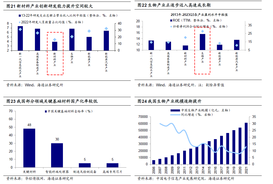 A股新质生产力板块中共有171家上市公司布局生物产业,在医疗器械、化学制药、生物制品均衡布局。当前我国生物产业还处在技术推动产业发展的起步上升阶段,未来生物产业在经济占比中有望持续扩大。从业绩来看,生物产业正步入快速成长期,各生物企业底层核心技术加速产业化,13-23Q3生物产业ROE和归母净利润增速的中枢值(下同)分别为15.6%、27.7%,均高于其他战略新兴产业。近期生物领域的研究成果已取得积极进展,23年11月首款CRISPR基因编辑疗法于英国获批上市,23年12月减肥药GLP-1受体激动剂入选《Science》十大年度科技突破之一,24年2月马斯克宣布首个植入Neuralink大脑芯片的人类患者或已完全康复。未来借助生物技术加速演进、生命健康需求快速增长的关键机遇,有望进一步推动生物产业成为促进经济发展的重要力量。