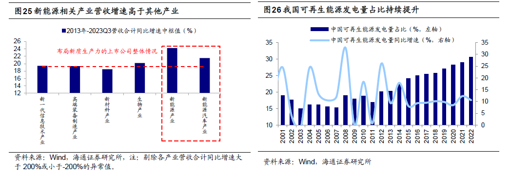 A股新质生产力板块中分别共有60家、99家上市公司布局新能源产业、新能源汽车产业,在光伏设备、电网设备、电子元器件产业链上下游等领域已大量布局。在电气化和智能化时代的背景下,我国新能源相关产业已逐渐形成领先优势。一方面,光伏、风电等可再生能源市场份额不断扩大,其发电量占我国发电量的比重从11年的17%上升至22年的31%;另一方面,我国新能源汽车正扬帆出海走向世界,电动载人汽车出口金额23年累计同比增长73.4%。从收入增速上来看,新能源产业、新能源汽车产业13-23Q3营收增速中枢值分别为24%、22%,较其他战略新兴产业更高。当前,我国新能源领域持续取得技术突破,23年11月中国科学院实验室制备的钙钛矿太阳能电池可将光电转换效率提升至26.1%,未来伴随相关政策扶持,叠加关键技术自主可控,相关新能源企业有望持续发展。