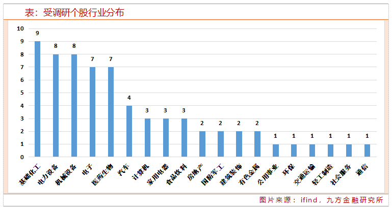 从行业分布来看,本期基础化工行业调研量居首,有9家上市公司接受调研;随后为电力设备、机械设备、电子、医药生物行业,均有超7家上市公司接受调研。