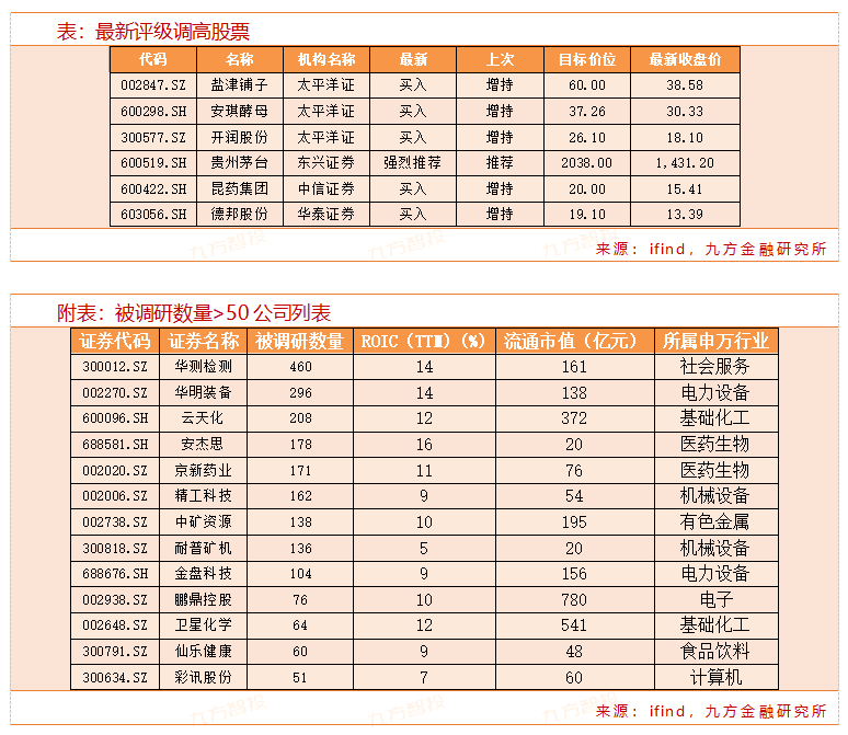 近5日有31家公司获得券商调高评级,盐津铺子、安琪酵母、开润股份、贵州茅台、昆药集团、德邦股份获证券给出明确目标价格。