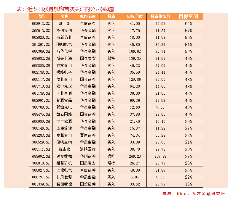最新机构首次关注股票方面,近5日共有72份研报对上市公司进行首次覆盖,其中,24家获得明确的目标价格。