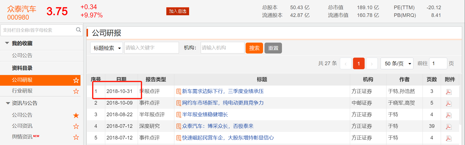 近五年众泰汽车无券商研报覆盖,上一份研报要追溯到2018年10月。