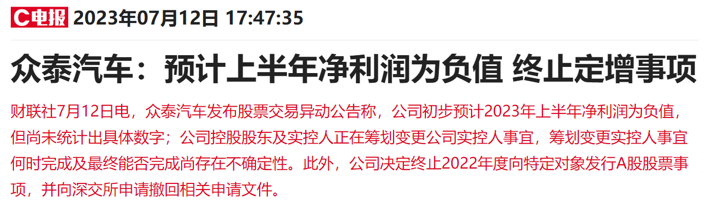 总市值近200亿元的新能源车概念股众泰汽车盘后发布股票交易异动公告,公司初步预计2023年上半年净利润为负值,但尚未统计出具体数字。同时,公司控股股东及实控人正在筹划变更公司实控人事宜,筹划变更实控人事宜何时完成及最终能否完成尚存在不确定性。