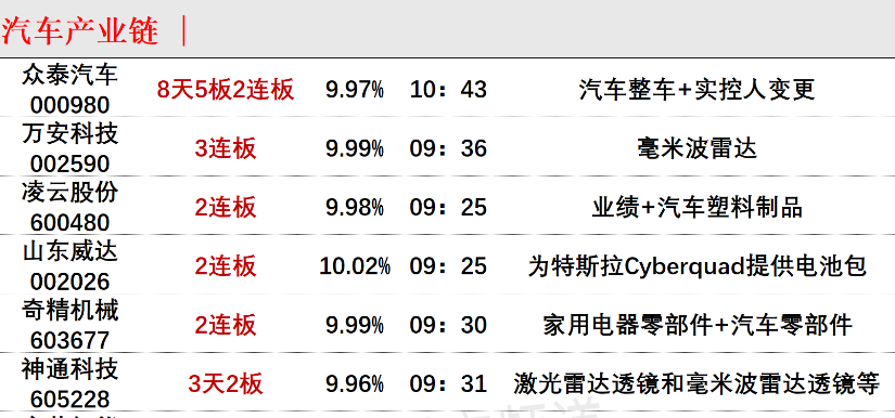 众泰汽车所属汽车产业链板块方面,万安科技3连板,凌云股份、山东威达和奇精机械均2连板。