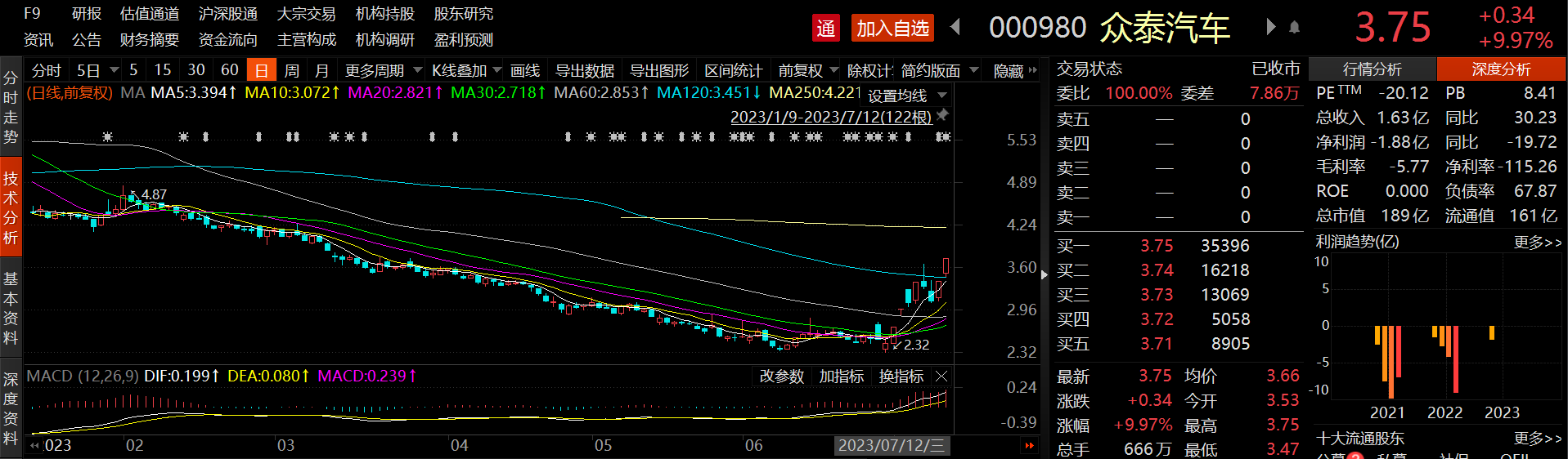 值得一提的是,众泰汽车收盘再度封板,最近八个交易日拿下五个涨停板。