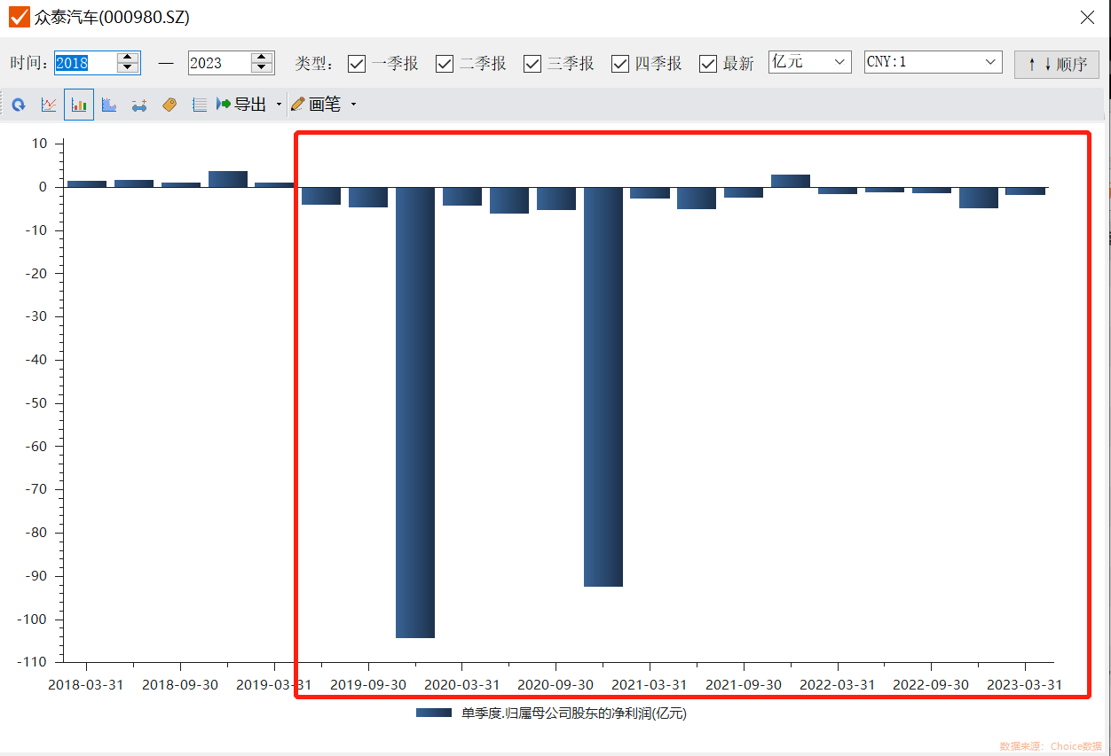 实际上,众泰汽车上半年业绩不乐观或在意料之中。数据显示,自2019年下半年以来,公司净利润大多处于负值状态,2023年第一季度,公司净亏损1.88亿元,同比扩大19.83%。