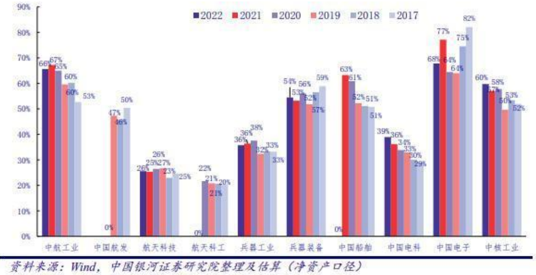 近年来,军工集团资产证券化运作持续不断,包括独立IPO、借壳、协议转让、分板块注入上市公司等,资产证券化率不断提升。据银河证券统计,根据2022年数据,分集团来看,资产证券化率在50%以上的有5家,分别是中航工业集团、兵器装备集团、中国船舶集团、中国电子信息集团和中国核工业集团,其中中航工业集团和中国电子信息产业集团最高,分别为66%和68%。
