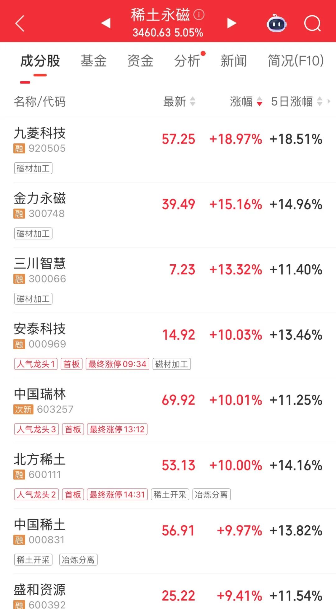 稀土永磁板块拉升,北方稀土等涨停。消息面上,商务部10月9日发布2025年第61号和第62号公告,分别公布对境外相关稀土物项实施出口管制的决定,以及对稀土相关技术实施出口管制的决定。