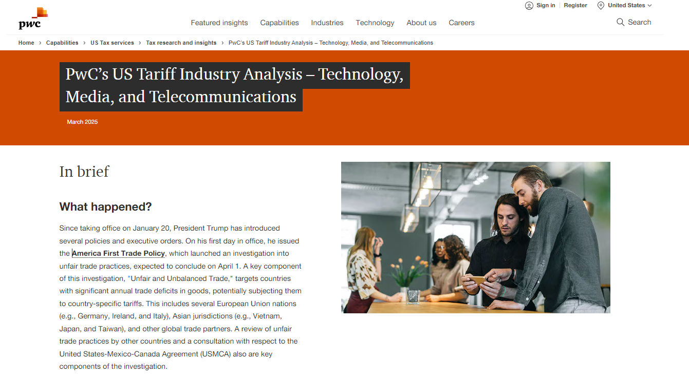 全球知名四大会计师事务所之一的普华永道在最新报告中指出,美国总统特朗普的关税政策可能会使美国科技、媒体和电信(TMT)行业每年损失1390亿美元。目前,全球企业正忙于评估财务风险,并重新考虑供应链。