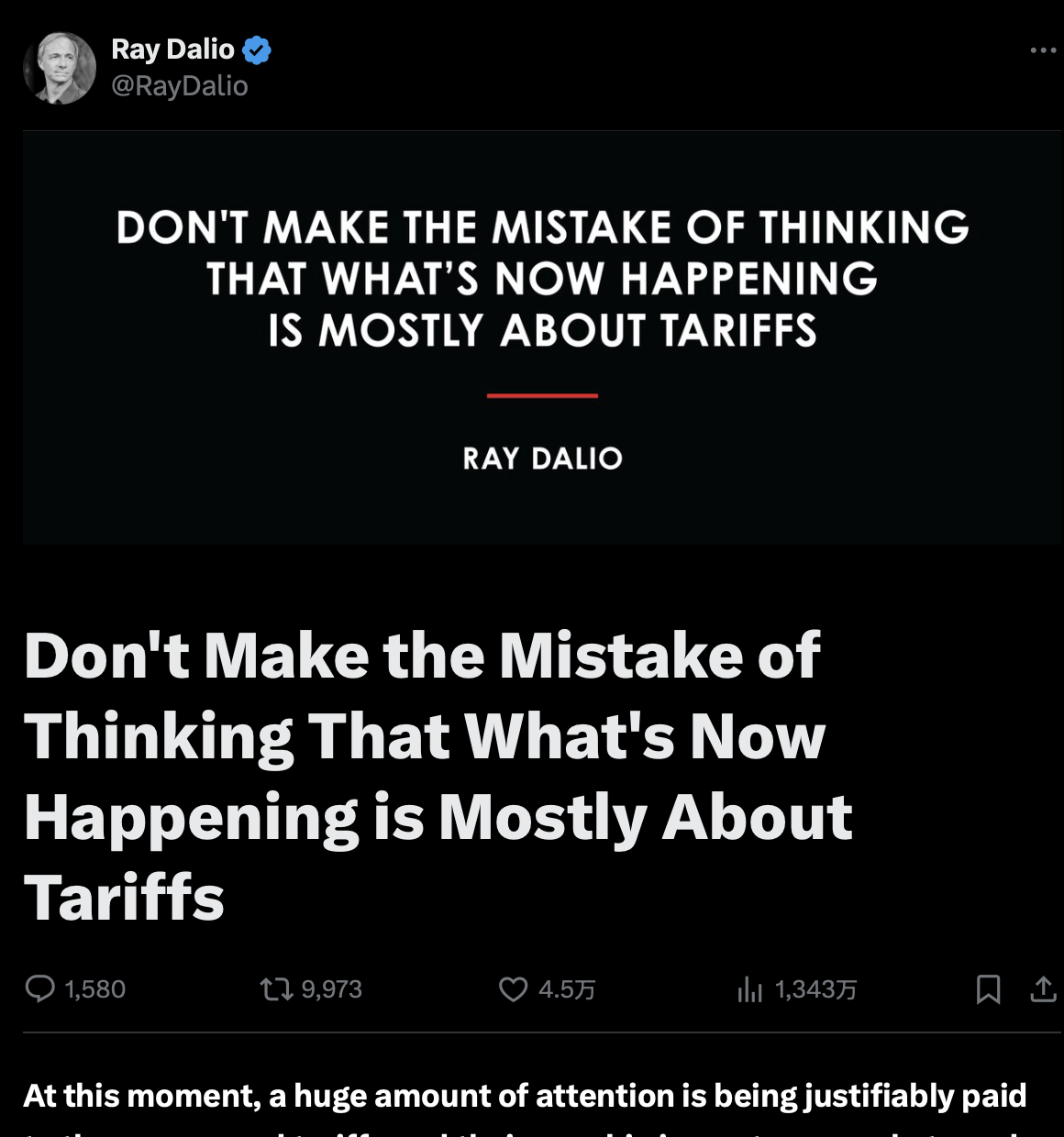 桥水达利欧:别只关注关税 全球秩序正经历百年一遇的崩塌