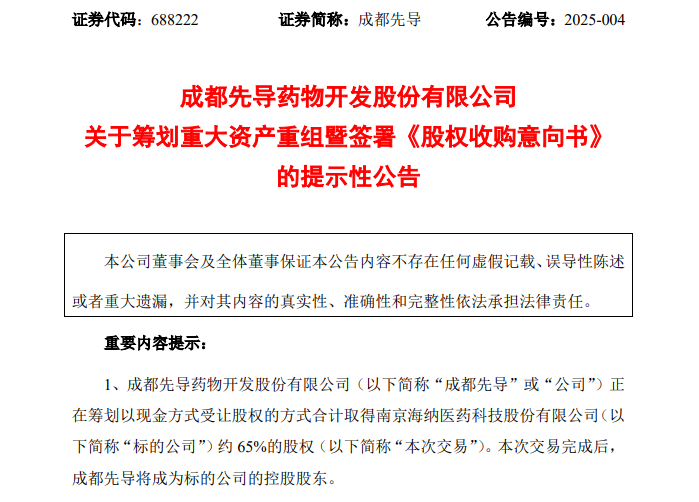 3月31日晚间,成都先导发布(688222)筹划重大资产重组暨签署《股权收购意向书》的提示性公告。