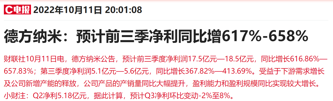 同时,总市值近500亿元的磷酸铁锂龙头德方纳米周二晚间公告,预计前三季度净利润17.5亿元—18.5亿元,同比增长616.86%—657.83%。