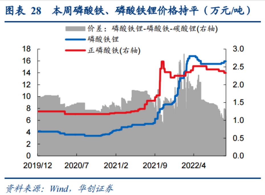 从价格走势看,本周磷酸铁锂报价16.25万元/吨,环比持平,整体来看,随着碳酸锂价格边际回落,磷酸铁锂价格亦有所回调。华金证券刘荆在6月20日研报中表示,由于2022年碳酸锂原料价格维持高位,磷酸铁锂价格预计较高,2023-2024年,随着磷酸铁锂行业内大规模产能释放,以及原料价格的走弱,预测磷酸铁锂的价格会逐步下行。