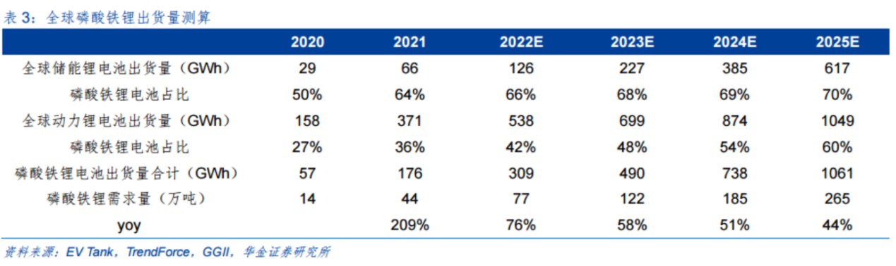 刘荆在研报中表示,随着技术突破,磷酸铁锂电池的能量密度显著提升,与三元电池的差距缩小。再叠加其低成本、高安全性等优势,磷酸铁锂电池在2021年逆袭三元电池,全年产量同比增长185%,远高于三元正极的增速,刘荆预计2025年,全球磷酸铁锂的需求量为265万吨,2021-2025年的年化复合增速为56.7%。