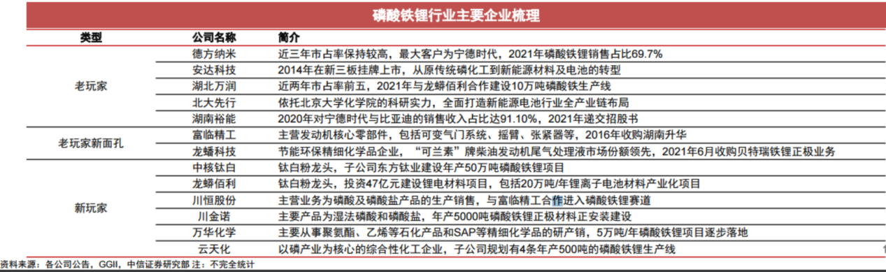 此外,中信证券袁健聪在5月24日研报中表示,近年来,磷化工、钛白粉等化工企业新玩家纷纷进入磷酸铁锂行业,进行多方位的布局。磷酸铁锂市场中新面孔代表企业有,中核钛白、龙蟒佰利、川恒股份、川金诺、万华化学、云天化等。