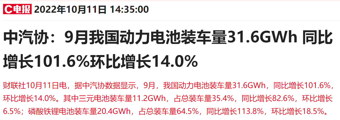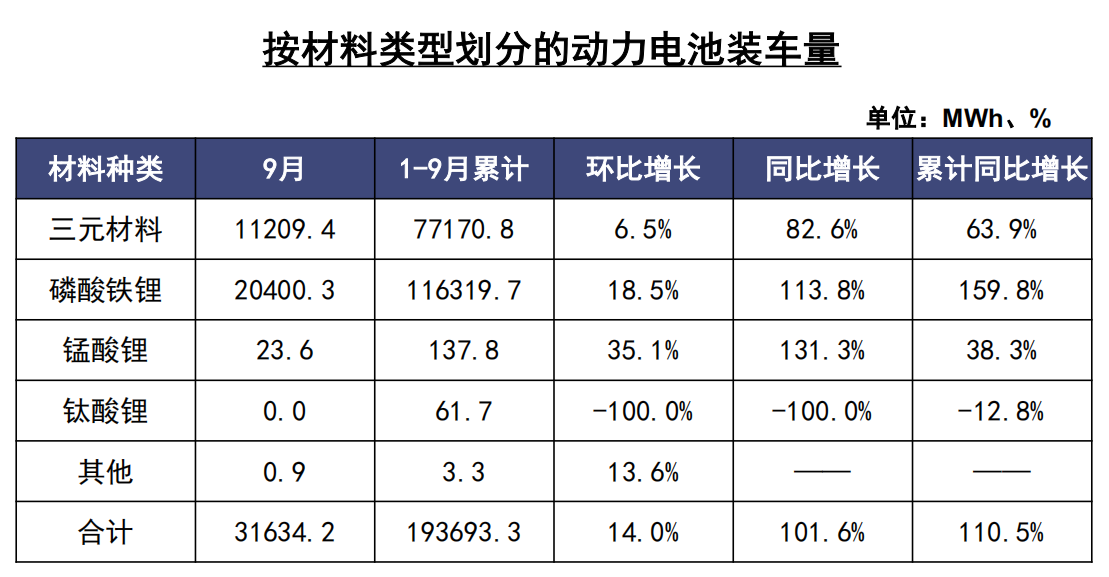 中汽协近期发布最新数据显示,9月,我国动力电池装车量31.6GWh,同比增长101.6%,环比增长14%。其中,磷酸铁锂电池装车量20.4GWh,占总装车量64.5%,同比增长113.8%,环比增长18.5%。